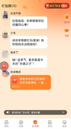 2、要在里面赚钱的话,可以点击下方红包群按钮,可以看到里面有很多不断出现的文字和红包,然后可以点击红包群出现的红包按钮进行开红包,具体就是这样的玩法,具体能在软件里面赚到多少钱,得看大家各自的手机价值,因为不同手机的价值是不一样的